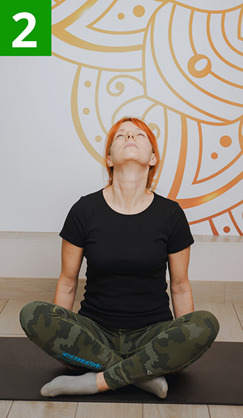 Usiądź wygodnie ze skrzyżowanymi nogami na macie. Dłonie umieść pod pośladkami. Głowa ustawiona prosto, wzrok skierowany przed siebie.