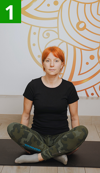 Usiądź w siadzie skrzyżnym na macie. Dłonie umieść pod pośladkami, plecy wyprostowane, wzrok skierowany przed siebie.
