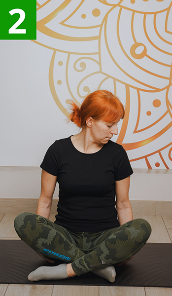 Usiądź w siadzie skrzyżnym na macie. Dłonie schowaj pod pośladki, plecy wyprostowane, wzrok skierowany przed siebie.