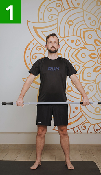 Stań prosto w lekkim rozkroku. Chwyć kij oburącz na szerokość barków, ramiona wyprostowane w dół przed sobą. Zachowaj luźne barki i spokojny oddech.