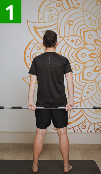 Stań prosto. Trzymaj kij oburącz z tyłu ciała na wysokości pośladków, dłońmi skierowanymi w tył. Ręce wyprostowane.