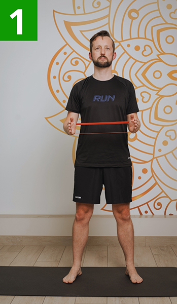 Stań w lekkim rozkroku. Ręce ugięte w łokciach pod kątem prostym, dłonie trzymają taśmę oporową na wysokości brzucha. Napnij taśmę, rozsuwając dłonie na boki.