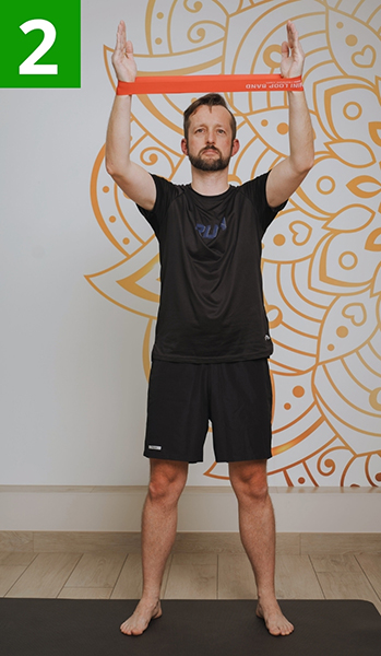 Utrzymując napięcie taśmy, unieś ręce w górę nad głowę i powoli wróć do pozycji wyjściowej. Nie pozwól, aby taśma się rozluźniła. Wykonaj 3 serie po 10 powtórzeń.